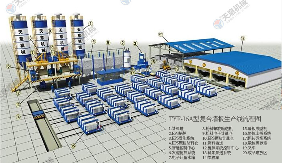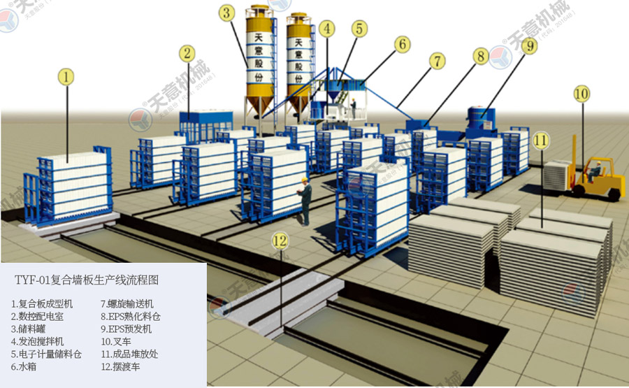 TY12型墻板生產線包括:墻板成型機、整體穿抽管系統、發泡系統、水箱、電子計量儲料倉、螺旋上料輸送機、儲料罐、螺旋輸送機、EPS熟化料倉、硫化干燥床、EPS預發機、數控配電室、發泡攪拌機、整體出板系統、叉車、成品堆放區、擺渡車。